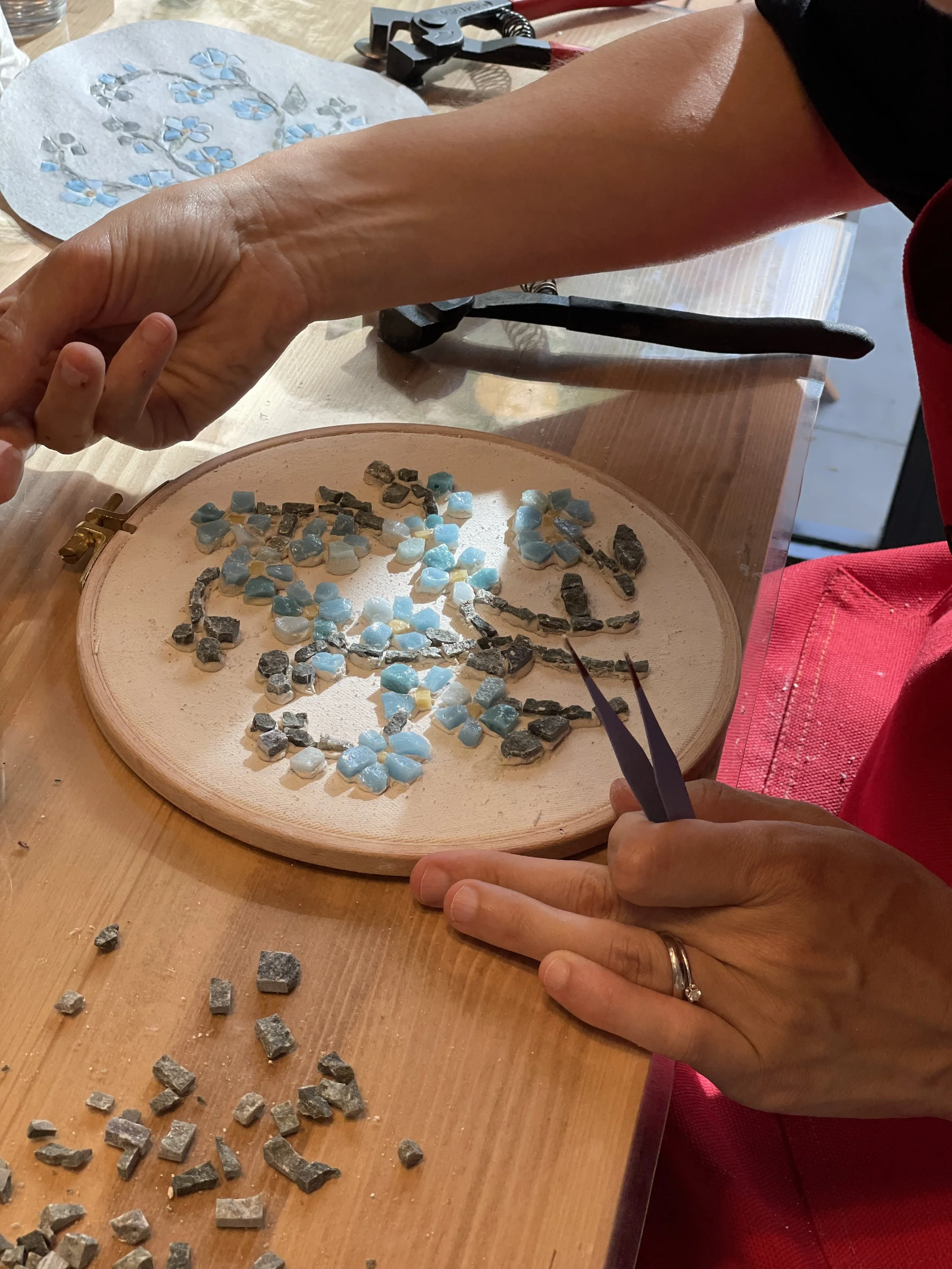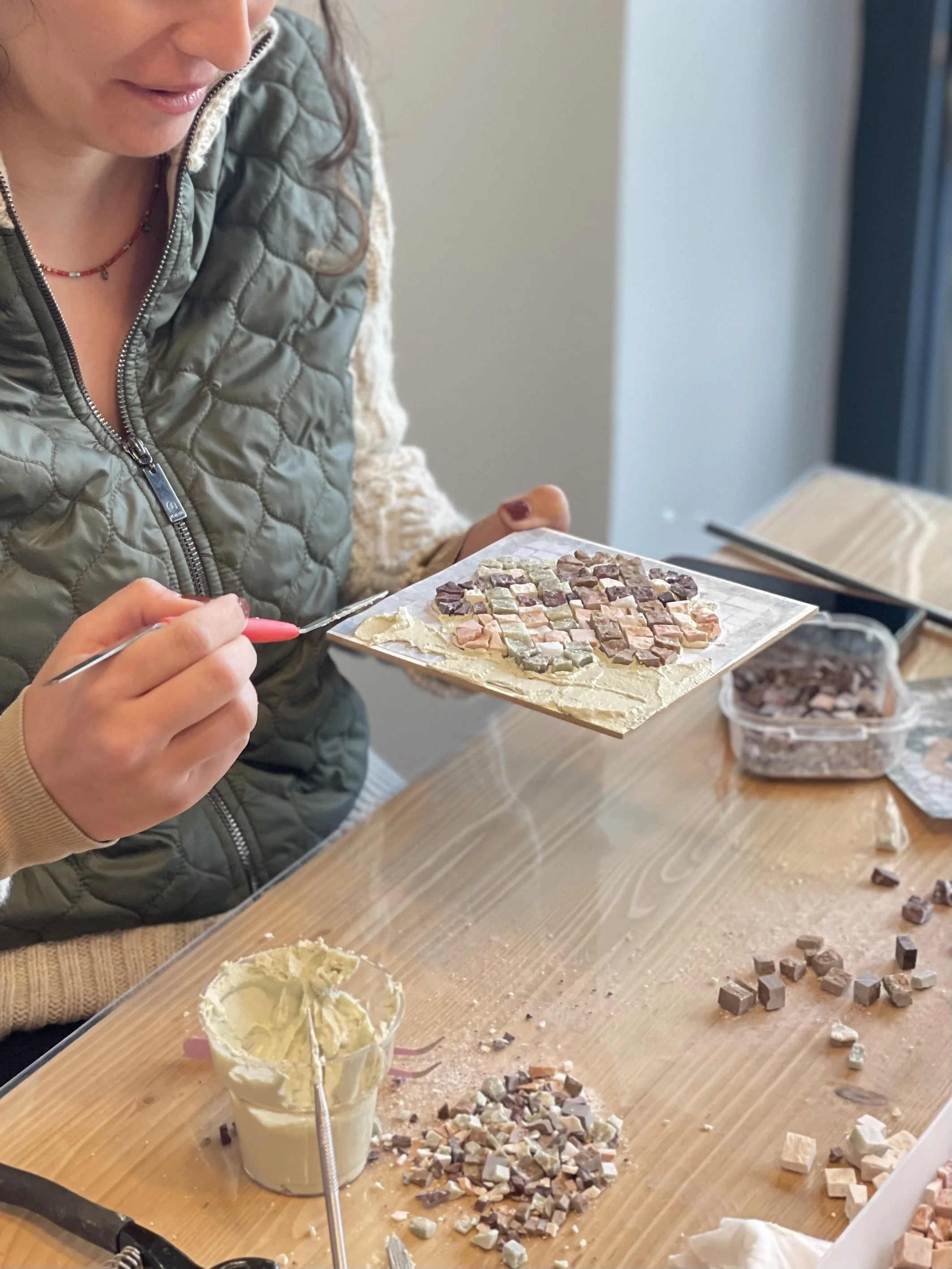 Kasnak üzerine mozaik → taşları nakış gibi işleyerek sabırlı ama keyifli bir süreç
