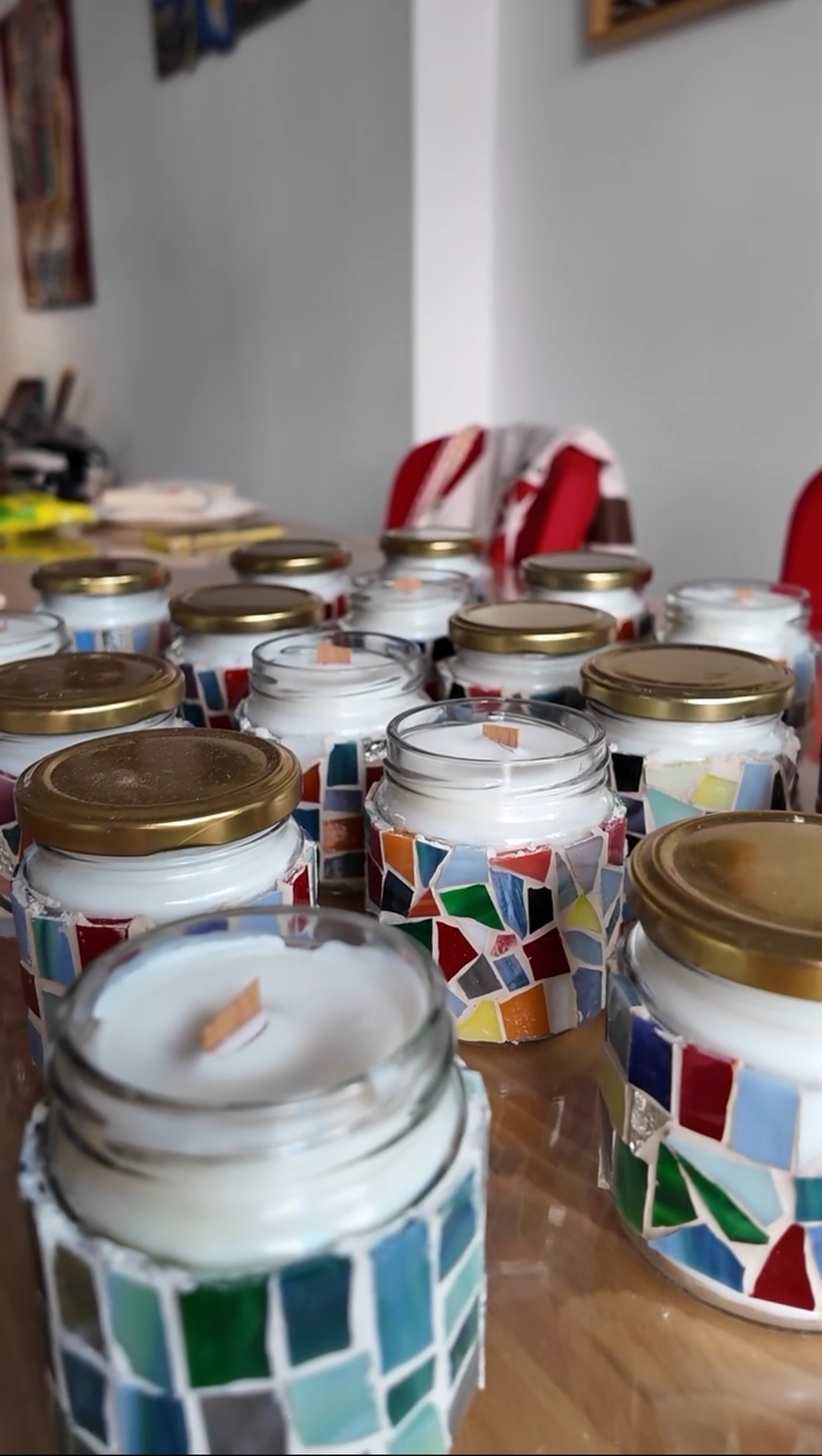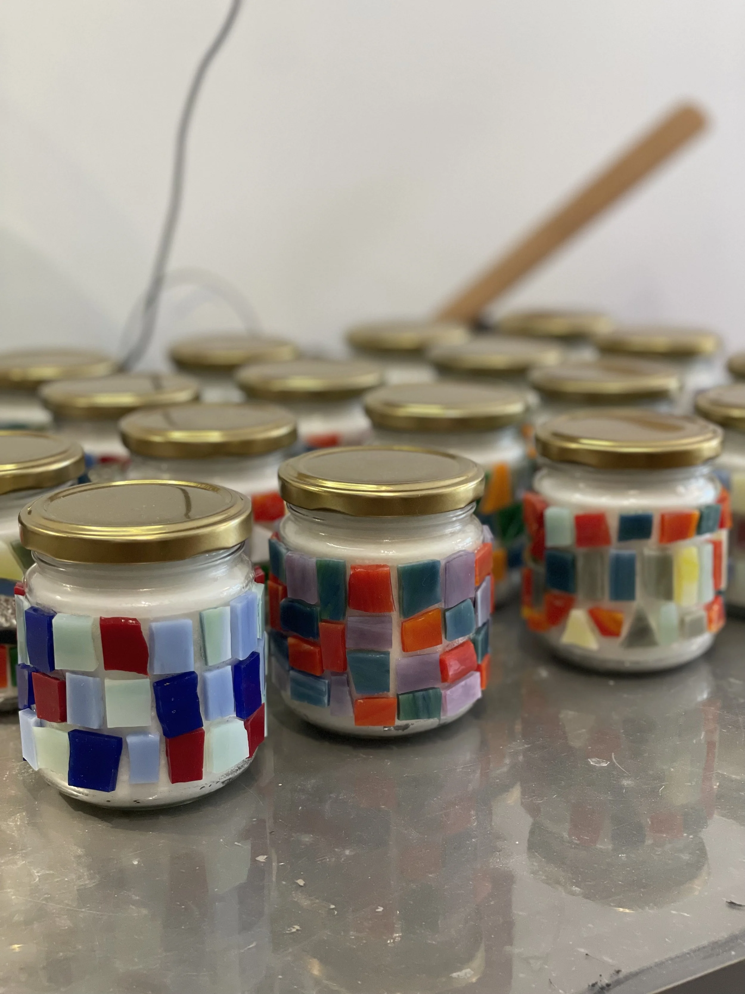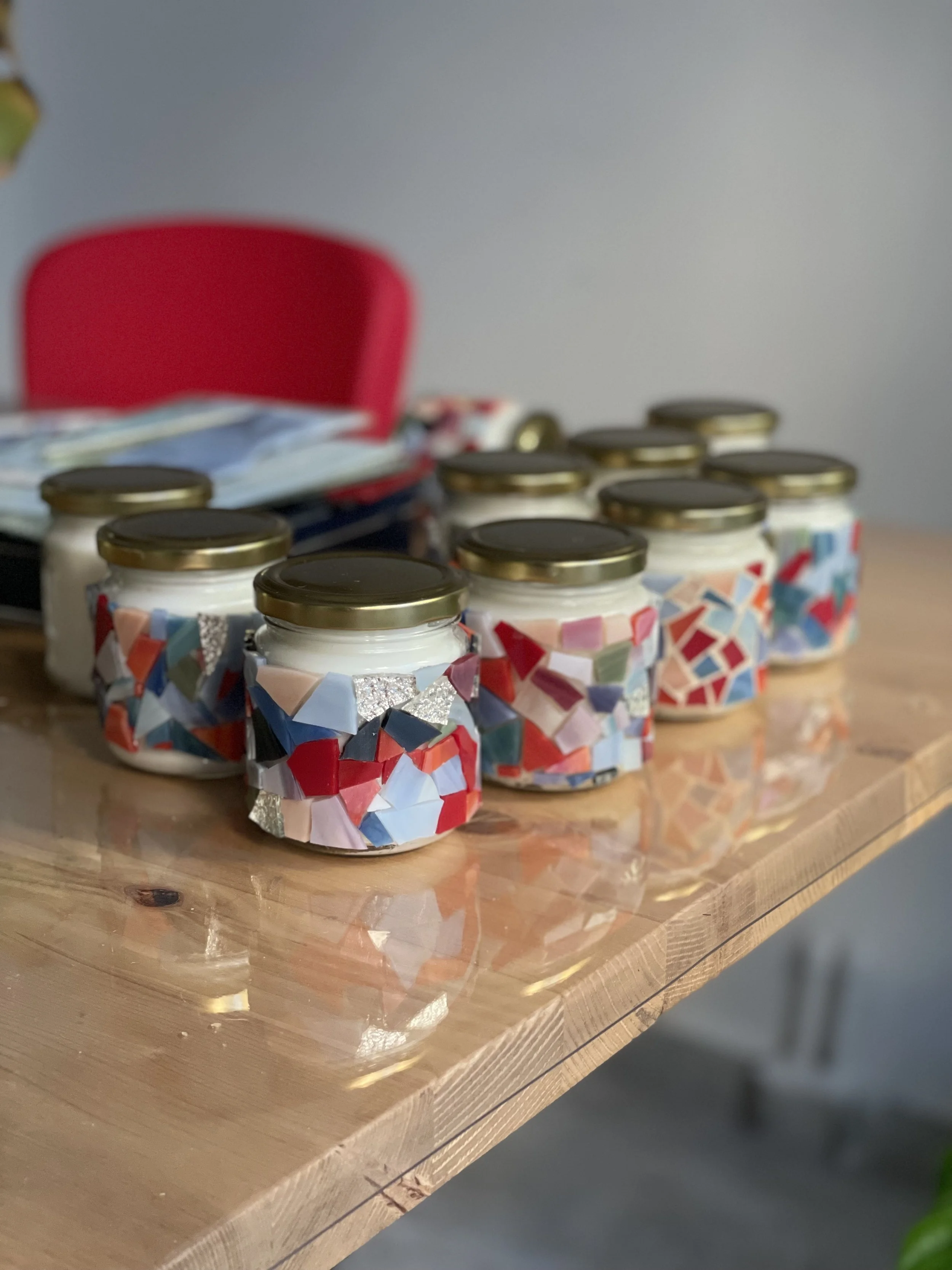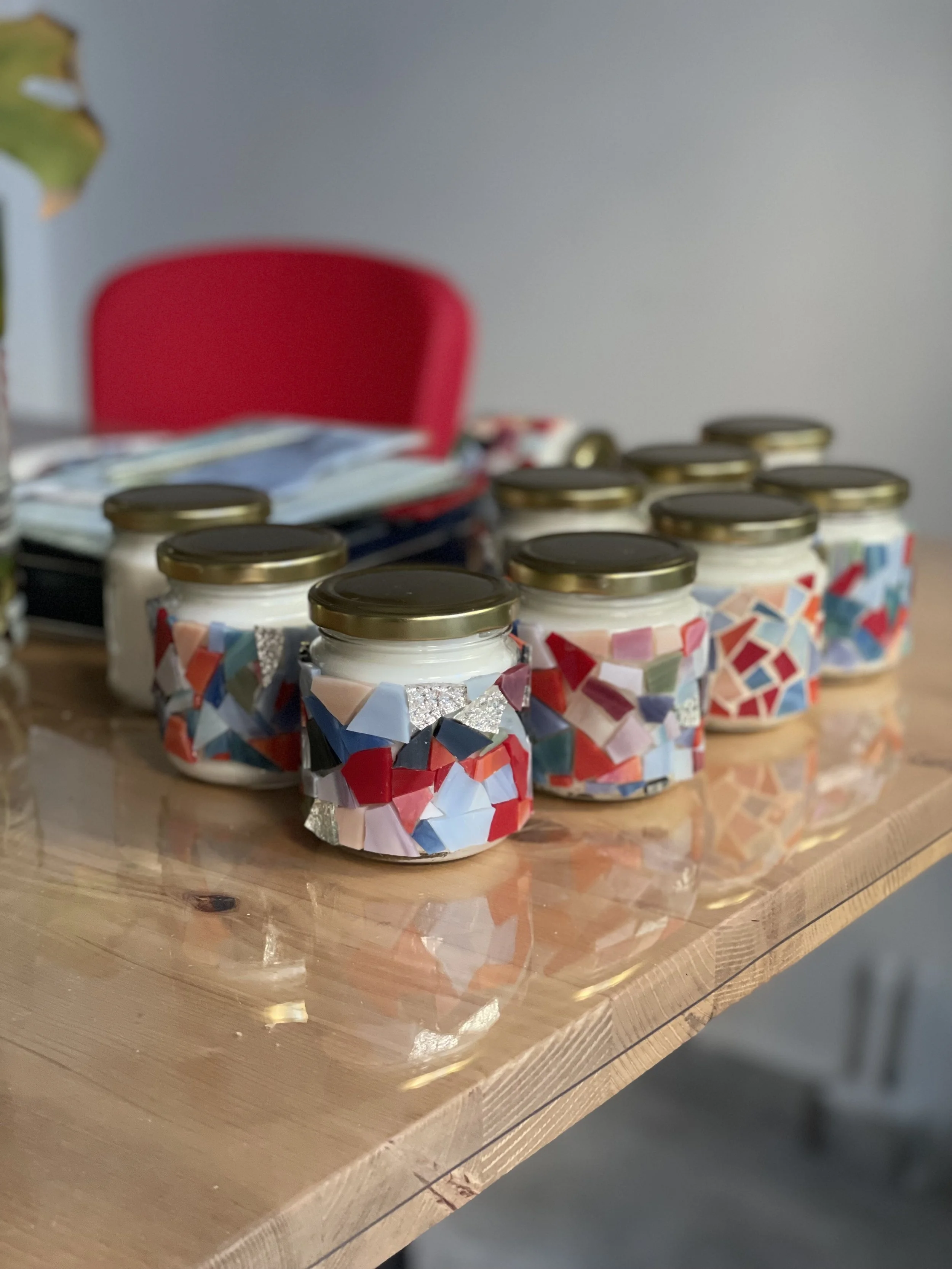 Bu proje, bir doğum kutlaması için hazırlanan el yapımı mozaik mumlardan oluşuyor. Öncesinde doğum yapacak kişiye ve yakınlarına küçük bir workshop düzenleyip mozaikleme sürecini anlattım, birlikte birkaç örnek çalıştık. Kalan hediyelikleri onlar evde tamamladı, derzleme ve son dokunuşları ise ben yaptım.