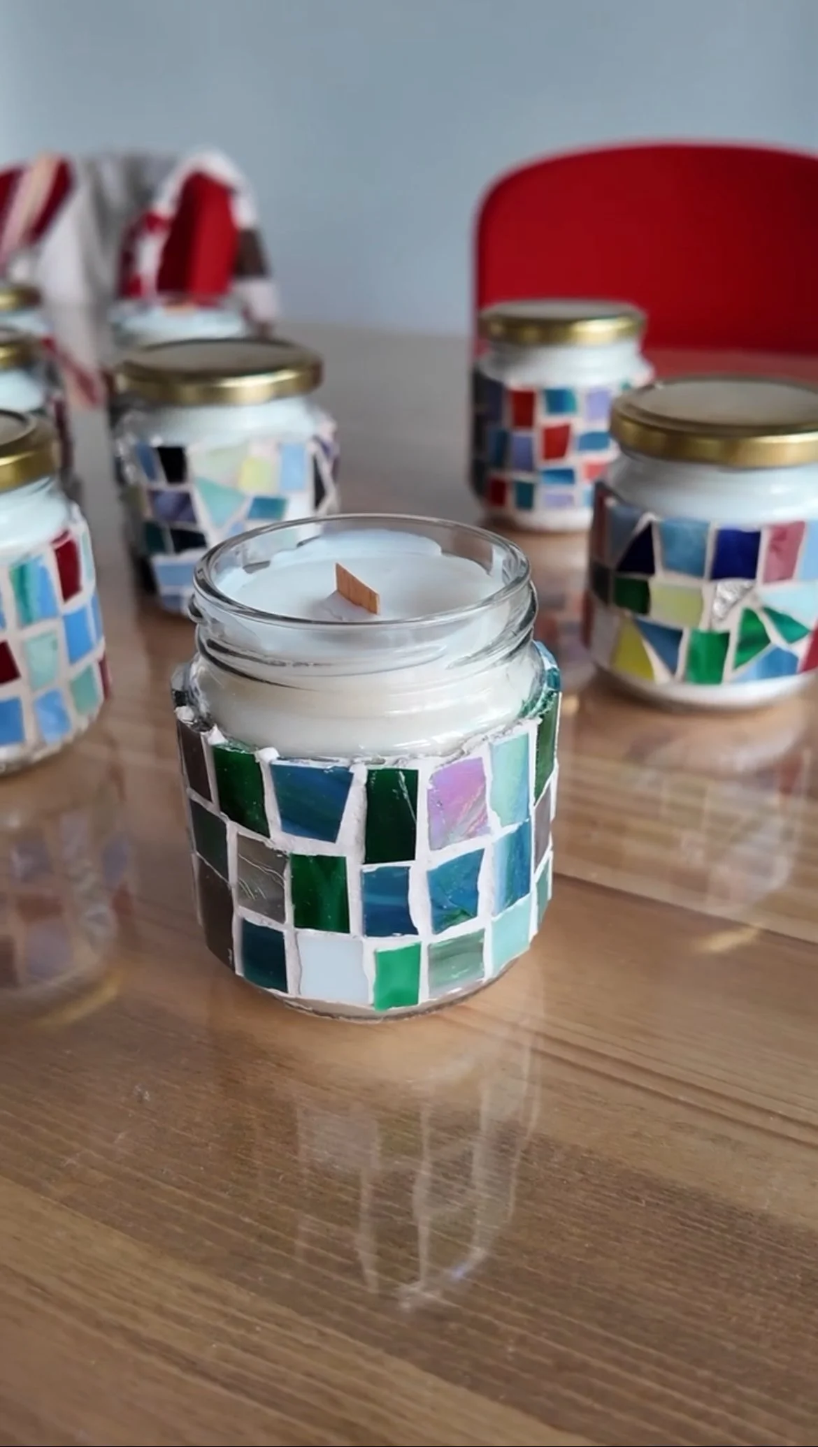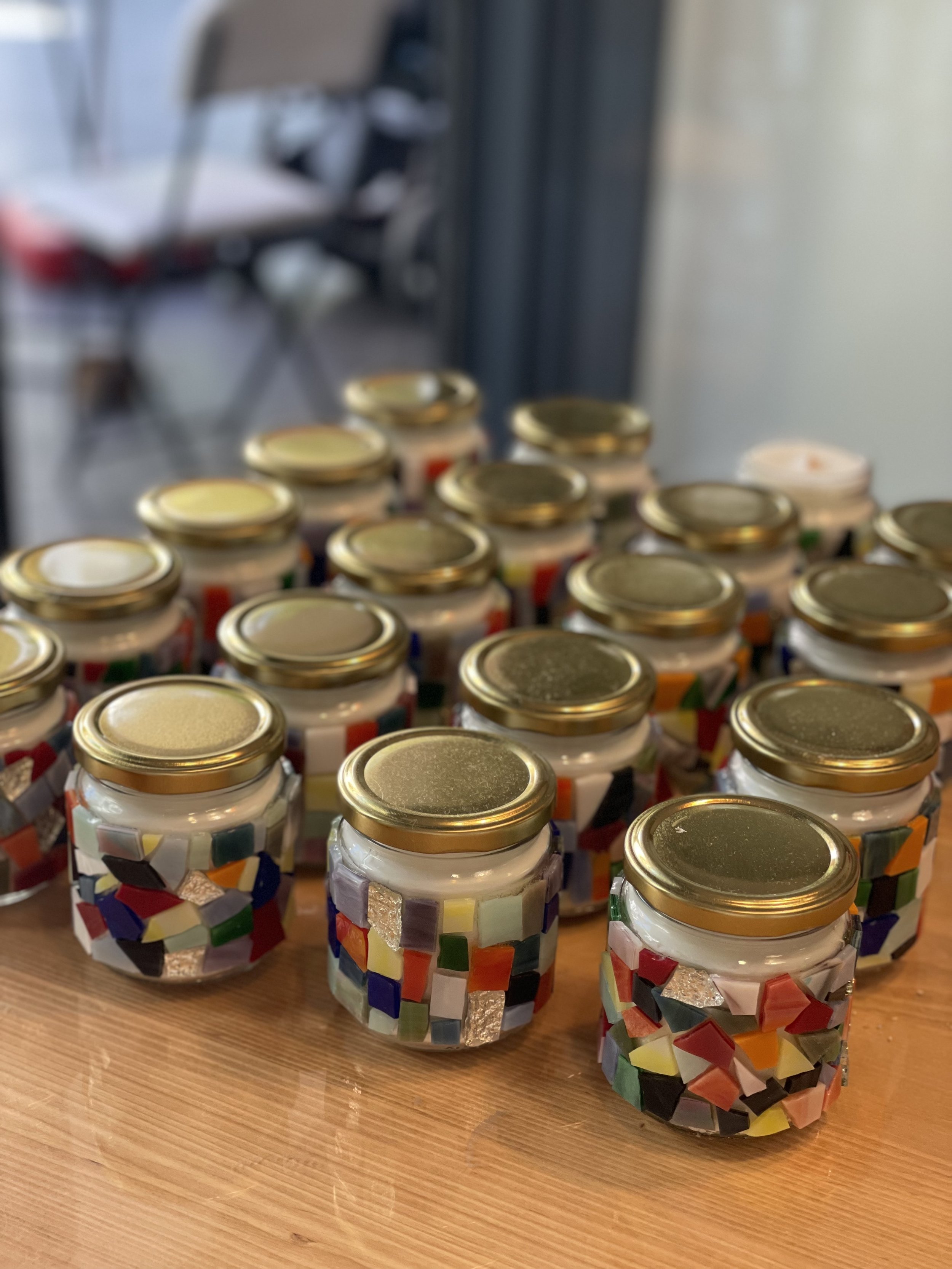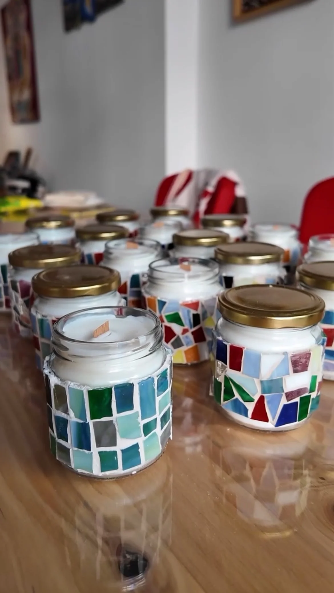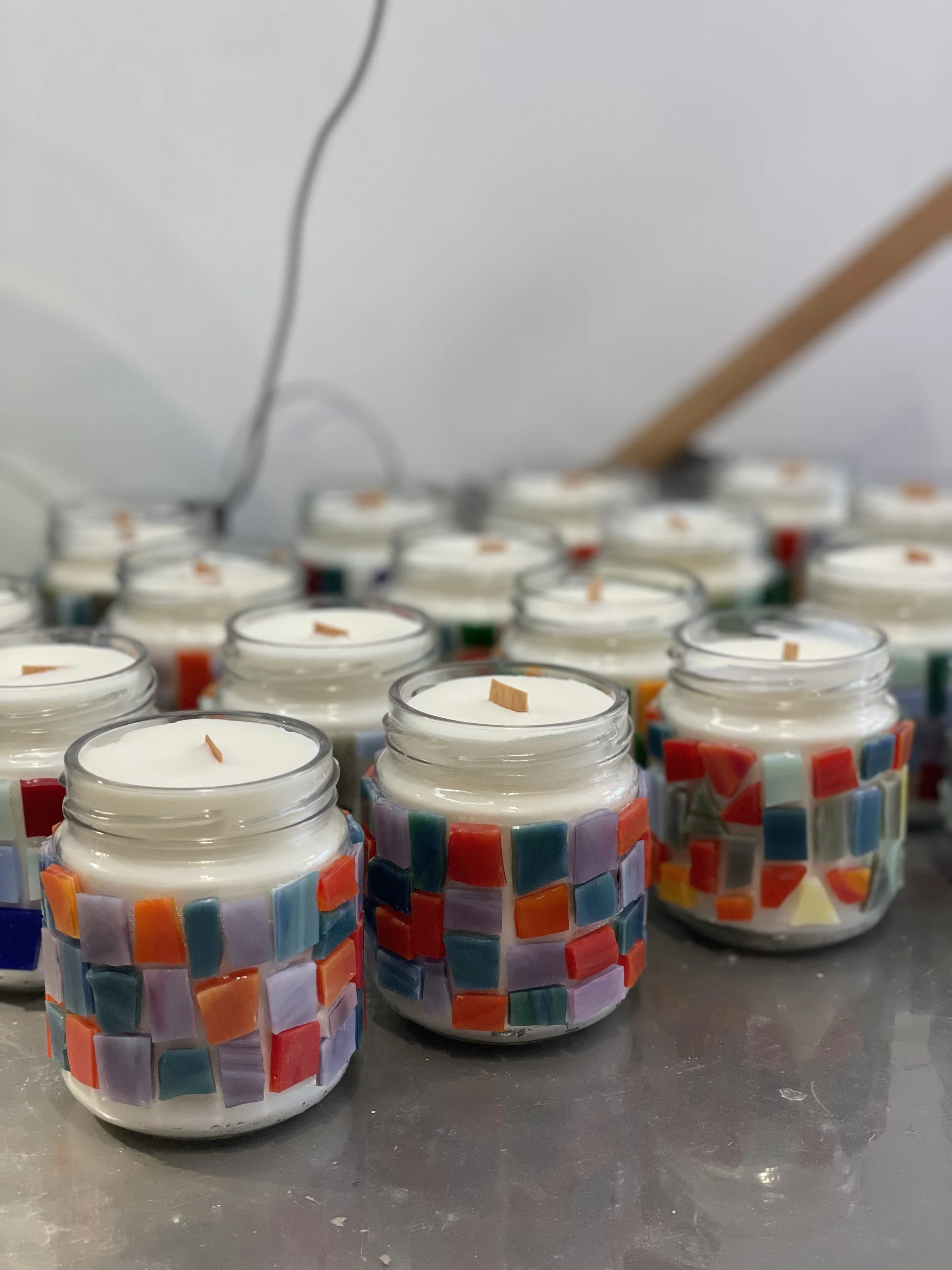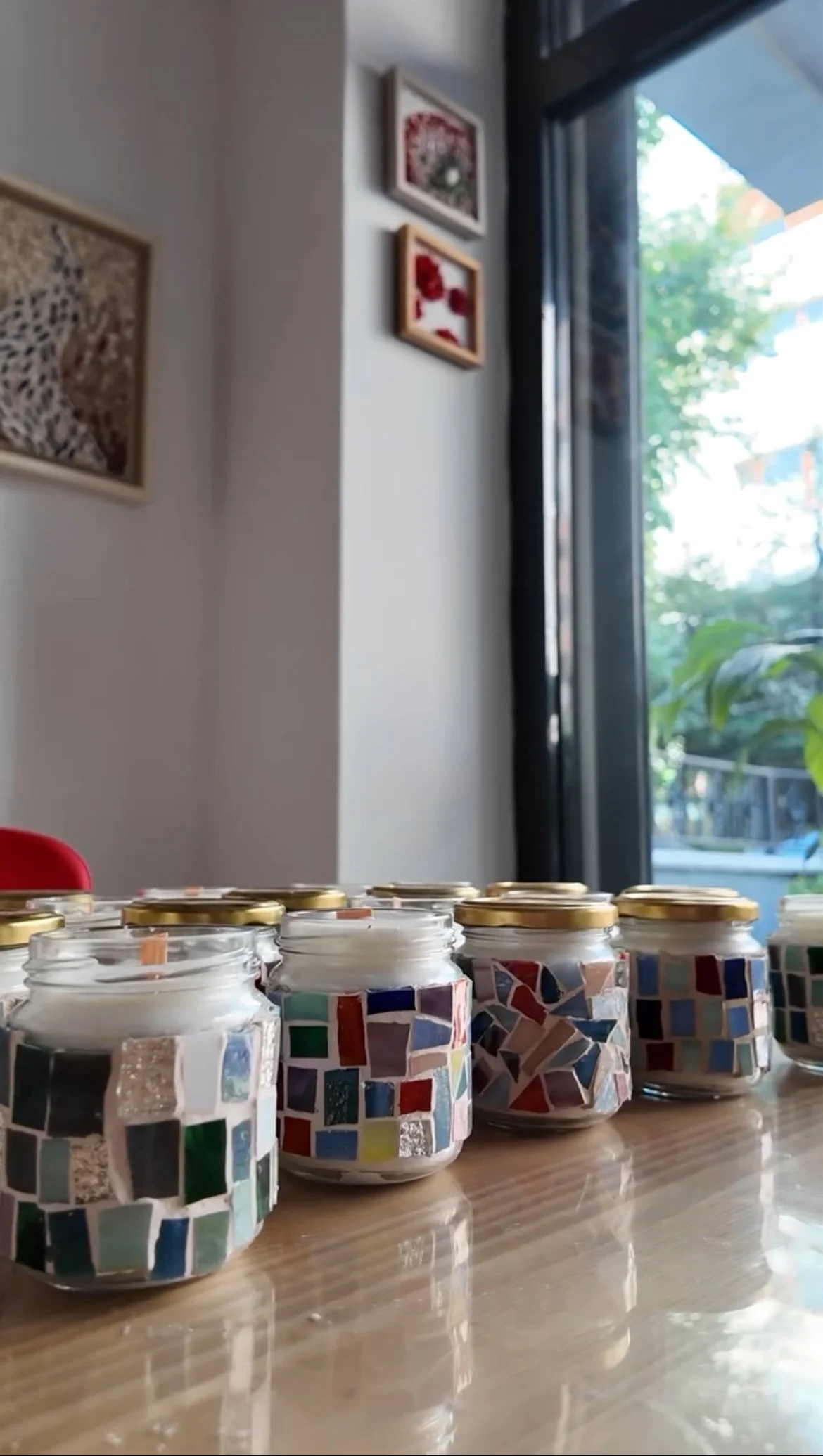 Bu proje, bir doğum kutlaması için hazırlanan el yapımı mozaik mumlardan oluşuyor. Öncesinde doğum yapacak kişiye ve yakınlarına küçük bir workshop düzenleyip mozaikleme sürecini anlattım, birlikte birkaç örnek çalıştık. Kalan hediyelikleri onlar evde tamamladı, derzleme ve son dokunuşları ise ben yaptım.
