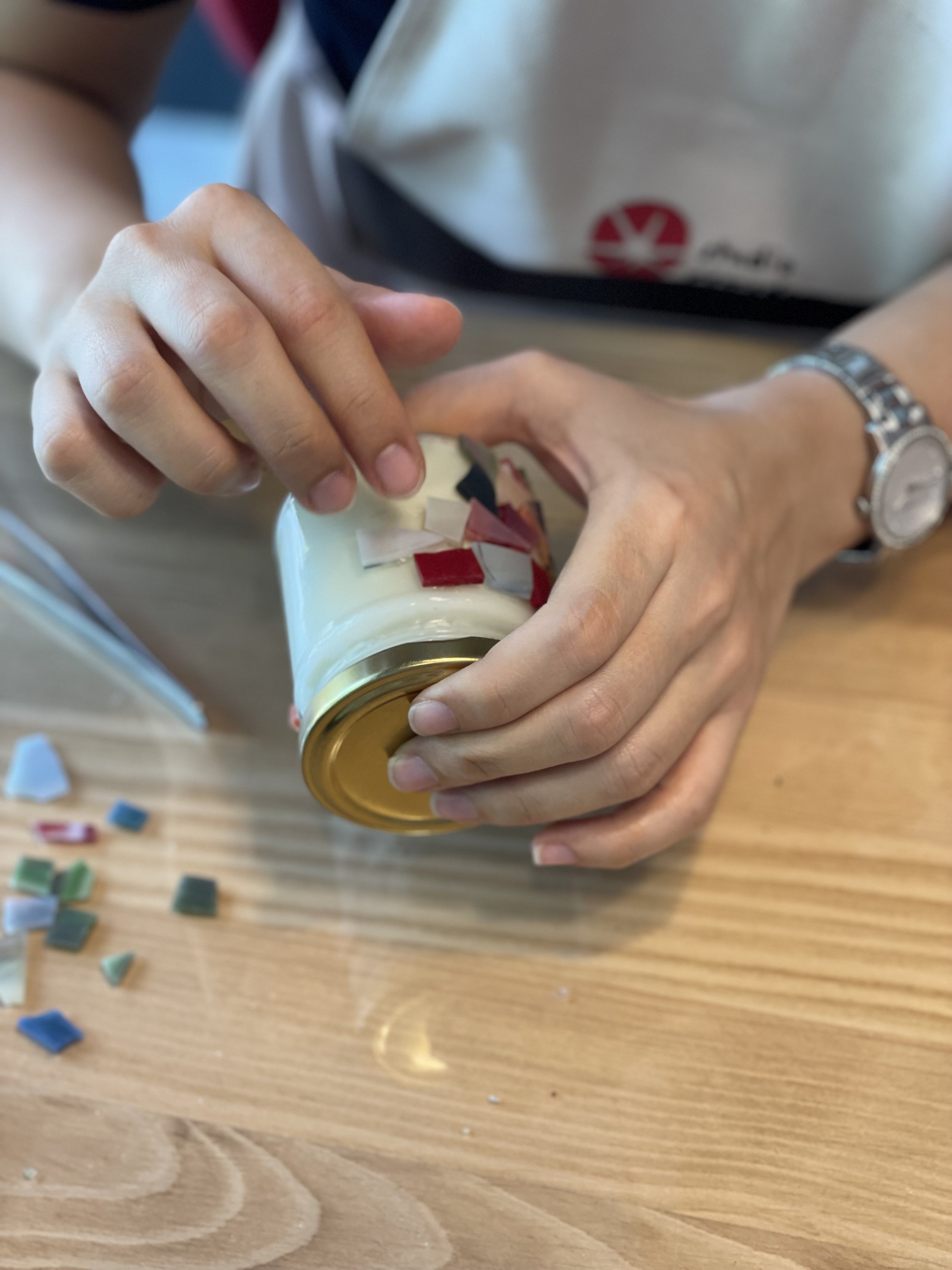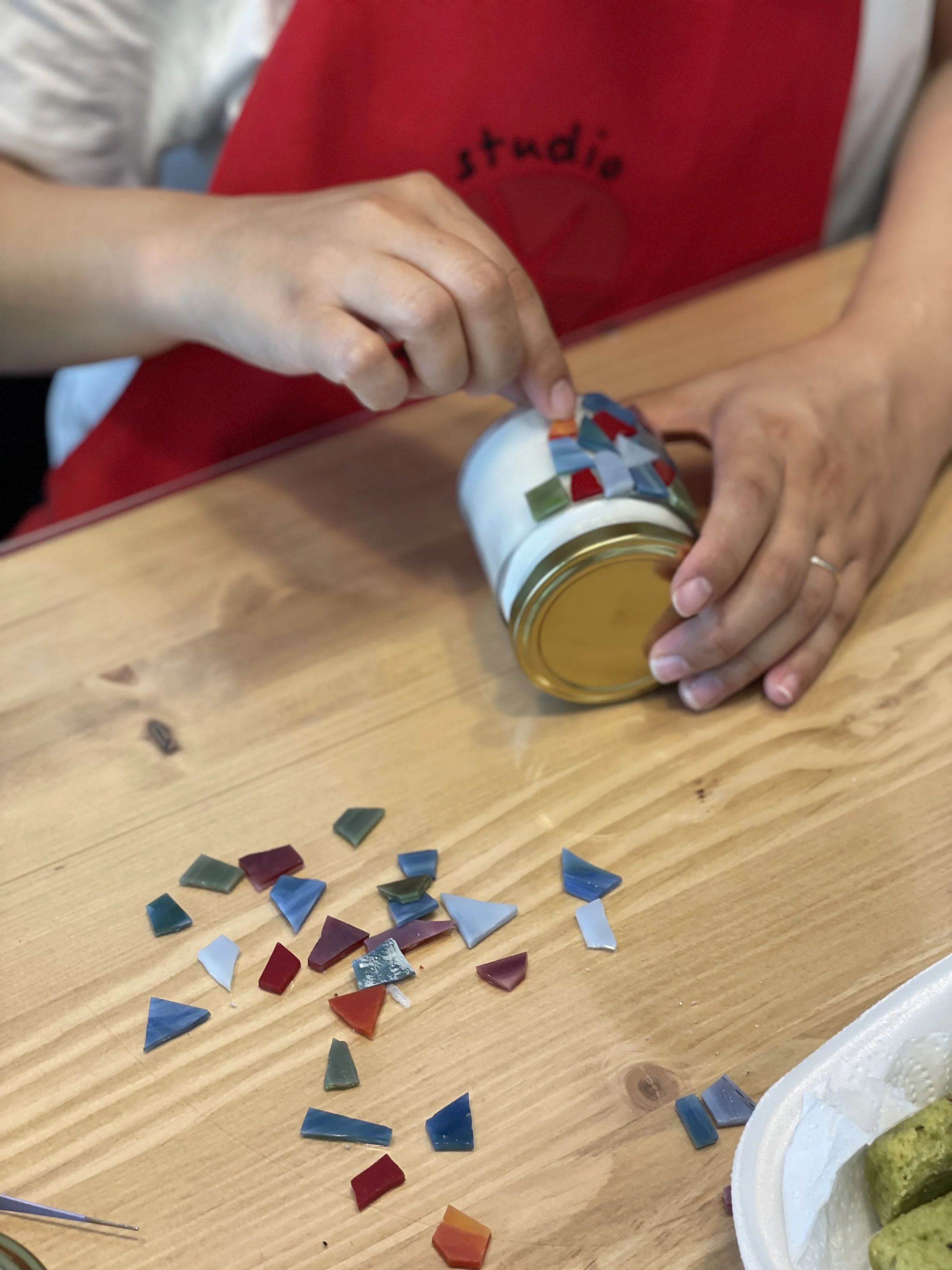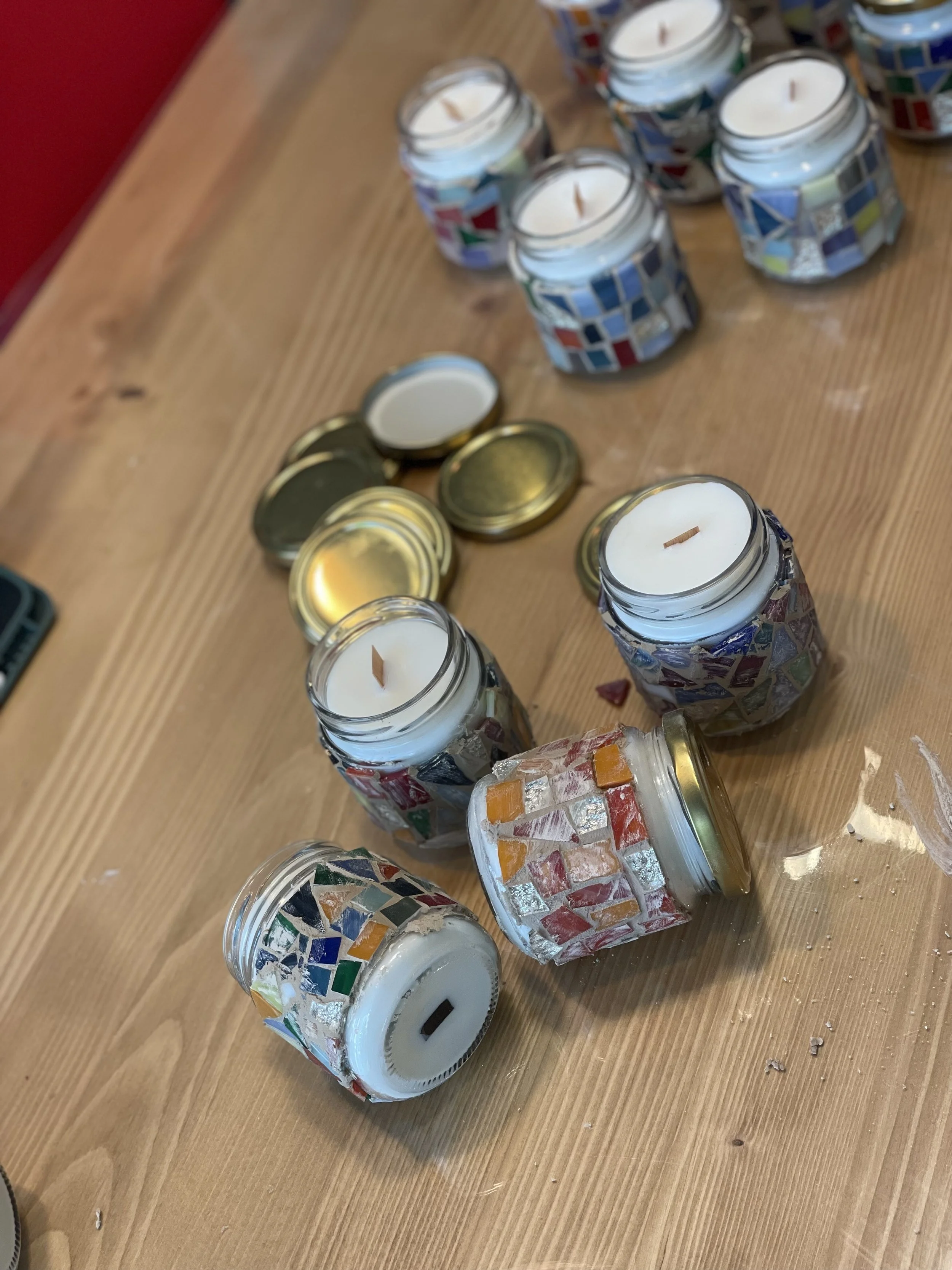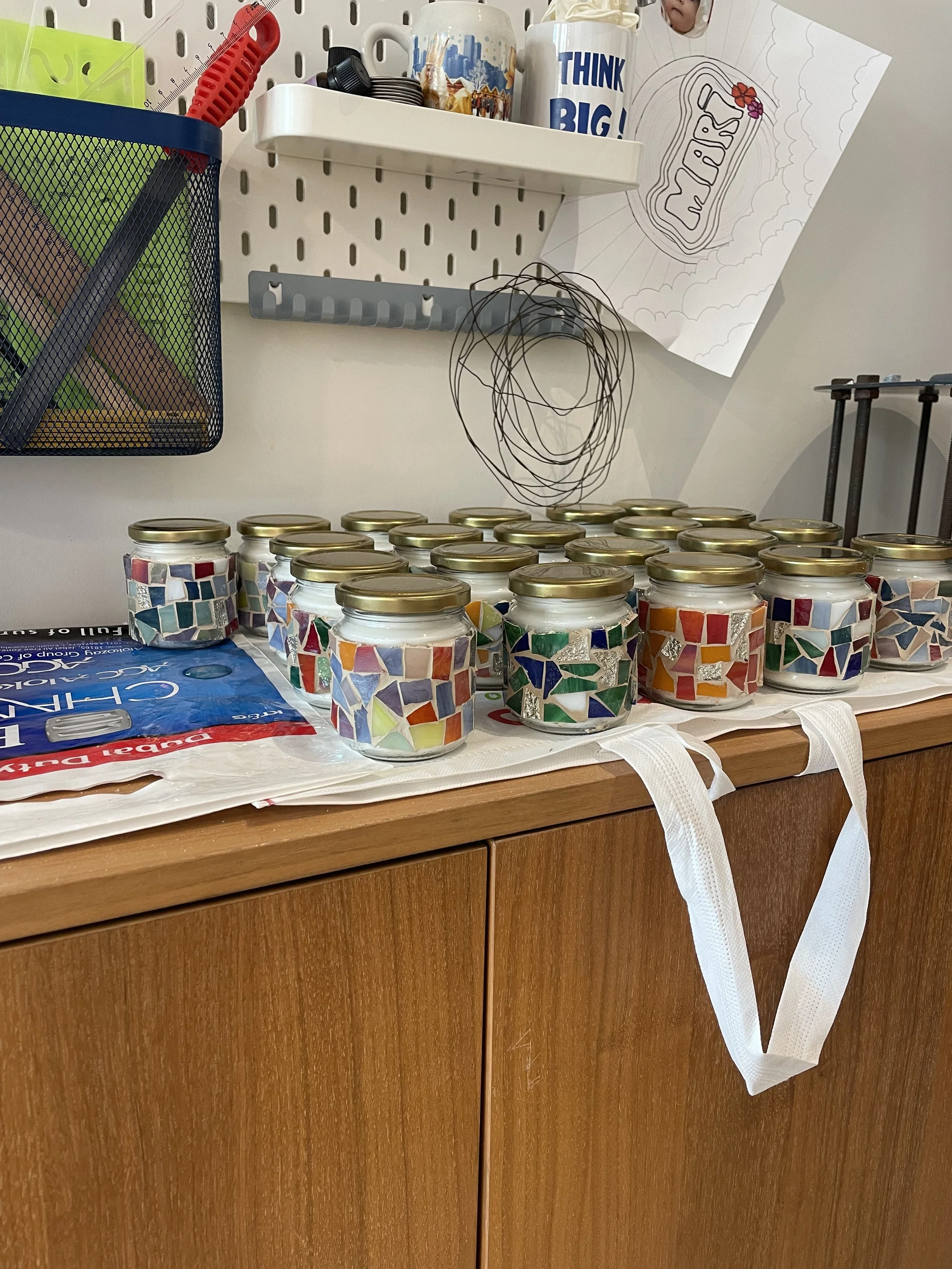 Bu proje, bir doğum kutlaması için hazırlanan el yapımı mozaik mumlardan oluşuyor. Öncesinde doğum yapacak kişiye ve yakınlarına küçük bir workshop düzenleyip mozaikleme sürecini anlattım, birlikte birkaç örnek çalıştık. Kalan hediyelikleri onlar evde tamamladı, derzleme ve son dokunuşları ise ben yaptım.