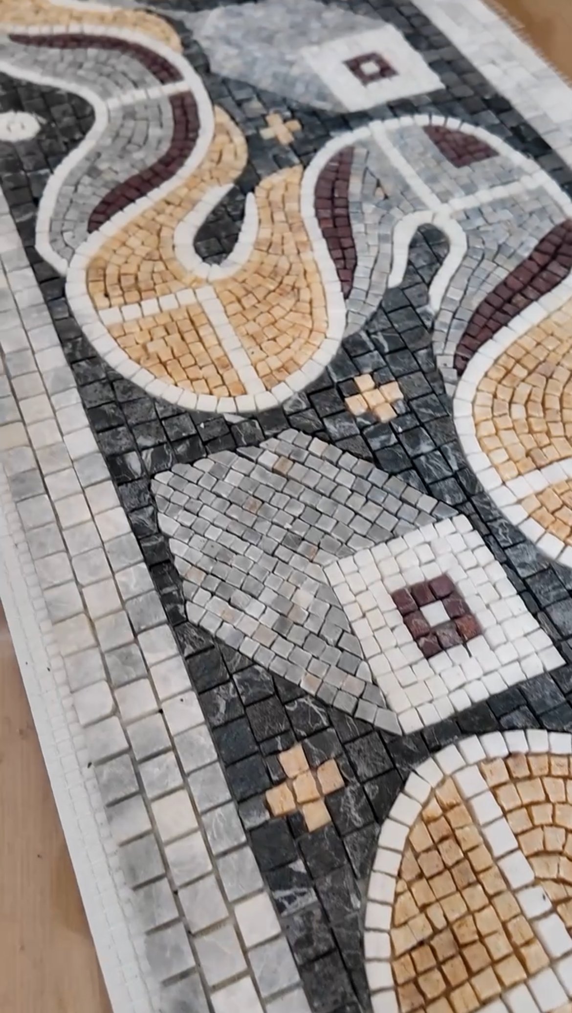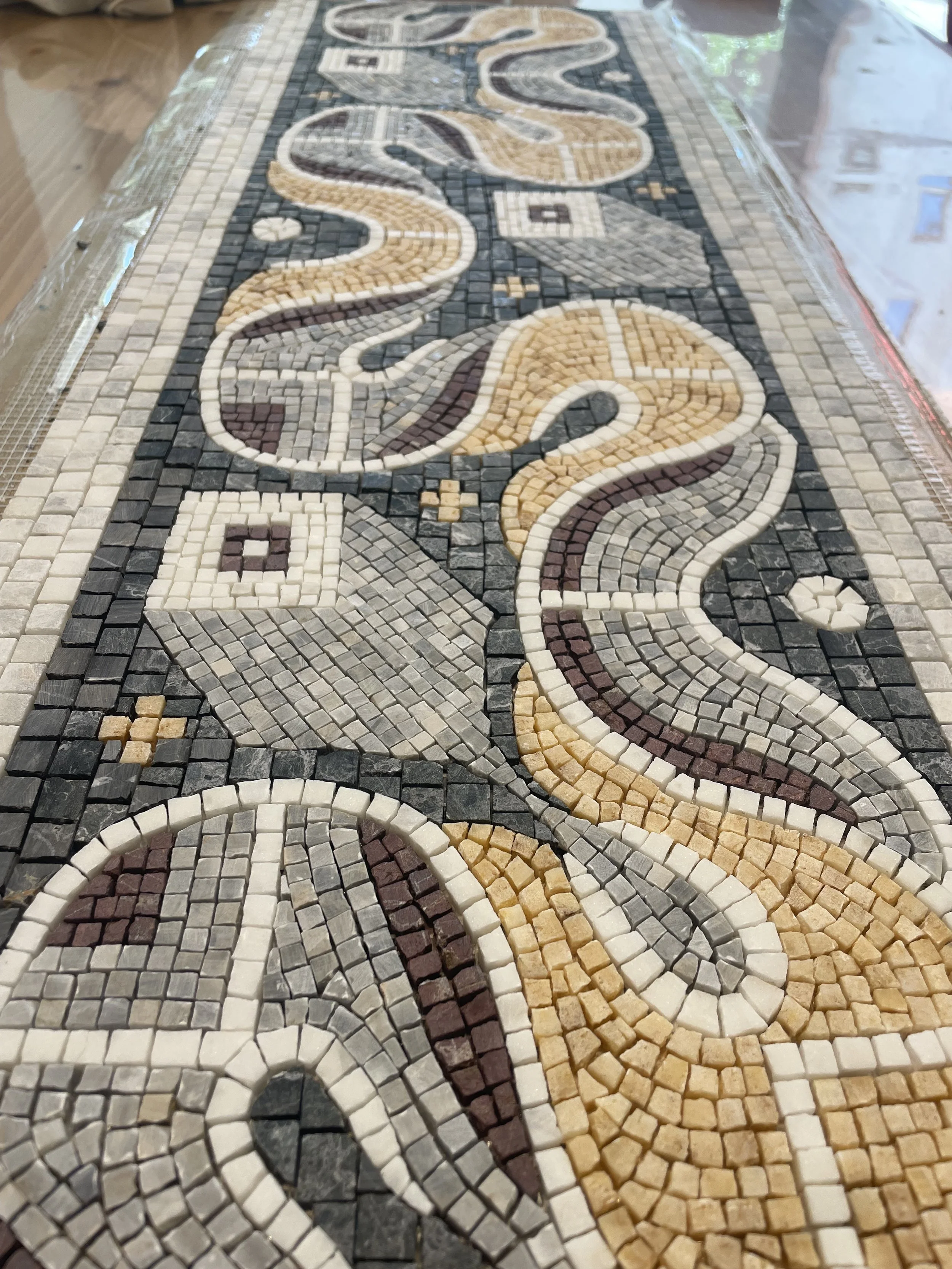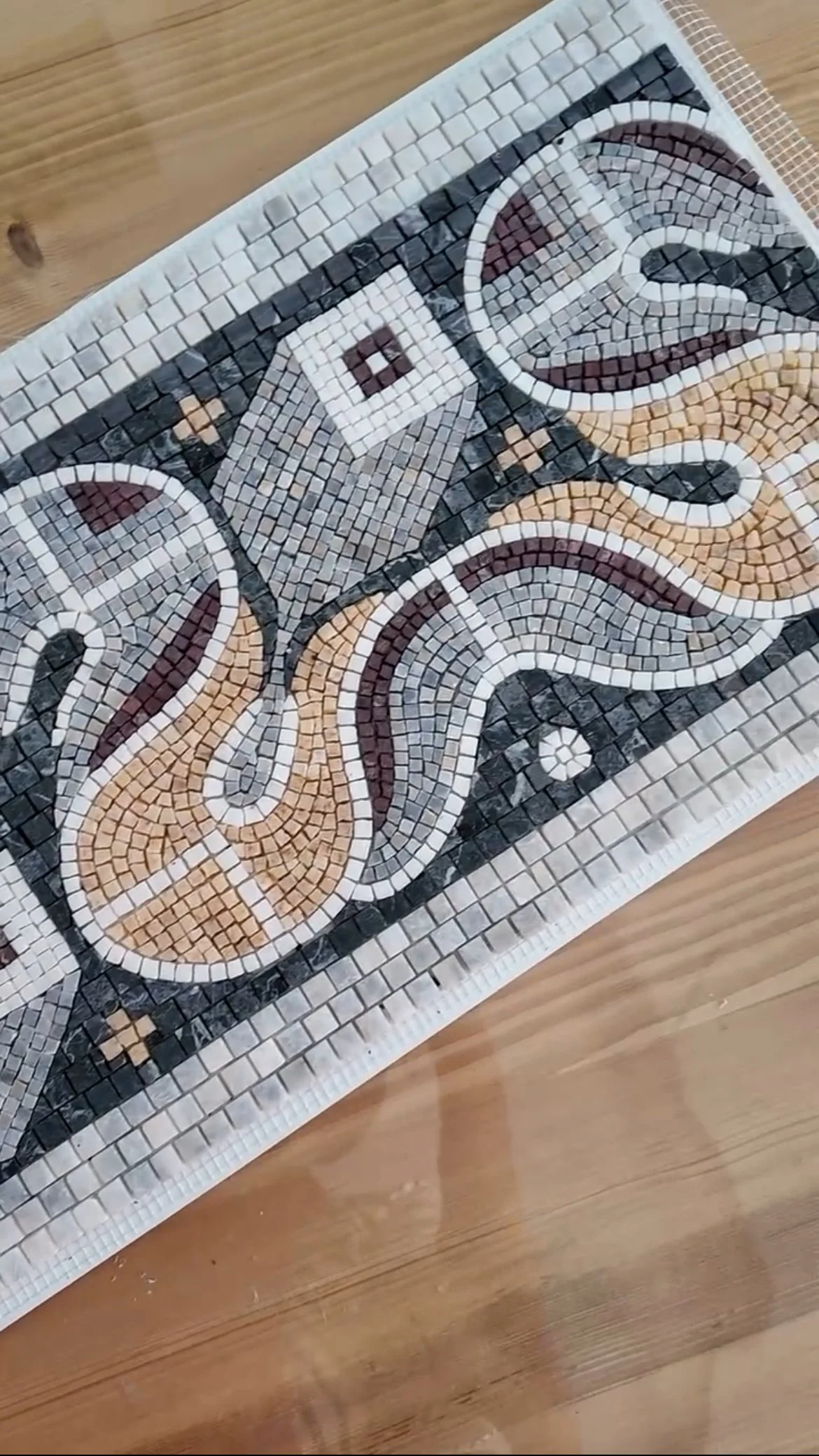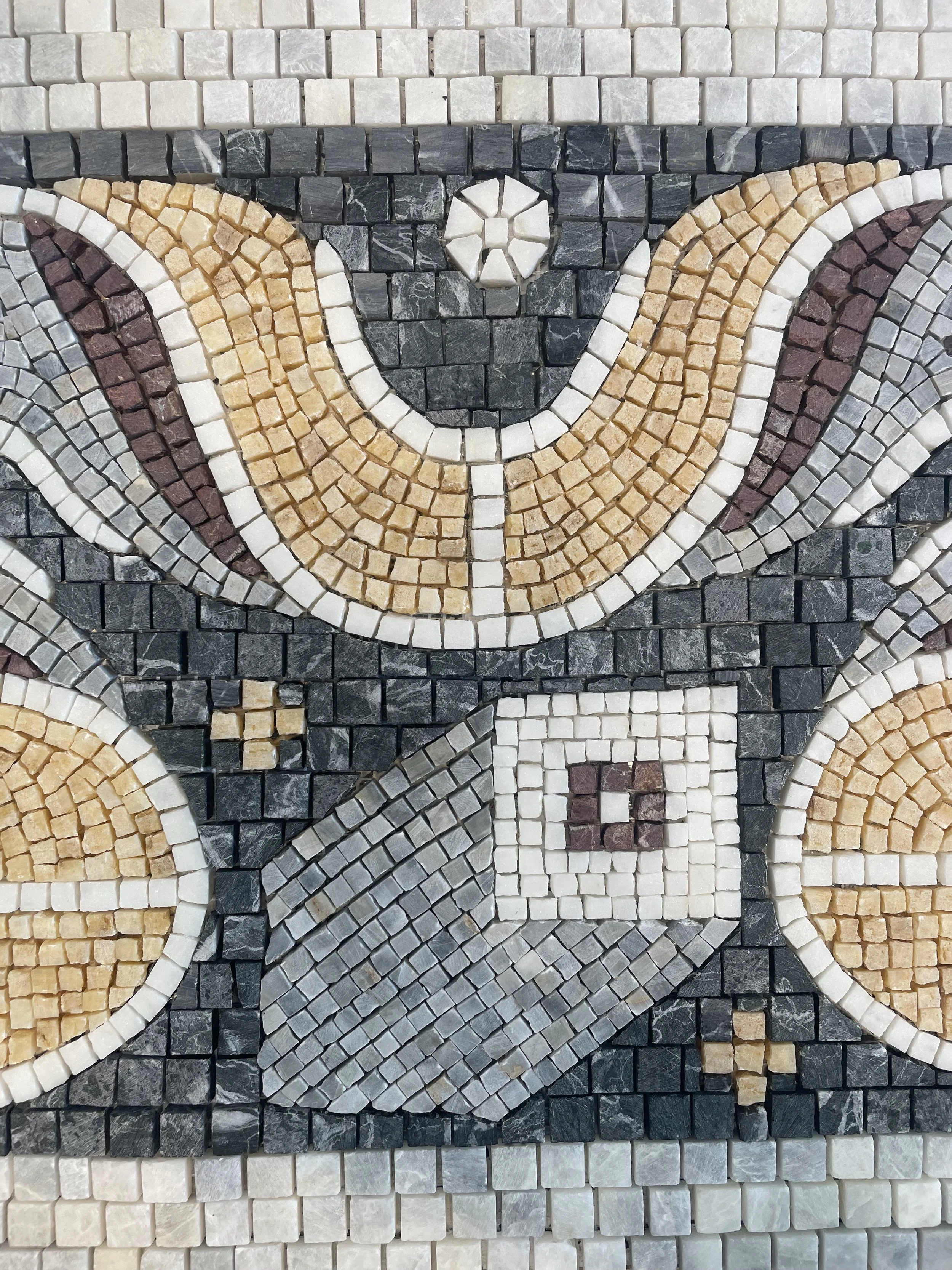 Bu 30x90 cm boyutundaki mozaik, Karabük’te yer alan Hadrianapolis Antik Kenti’nde bulunan geometrik zemin süslemelerinden esinlenerek tasarlandı. Özel sipariş üzerine, banyo aynası ve lavabo arasındaki alana yerleştirilmek üzere üretildi.