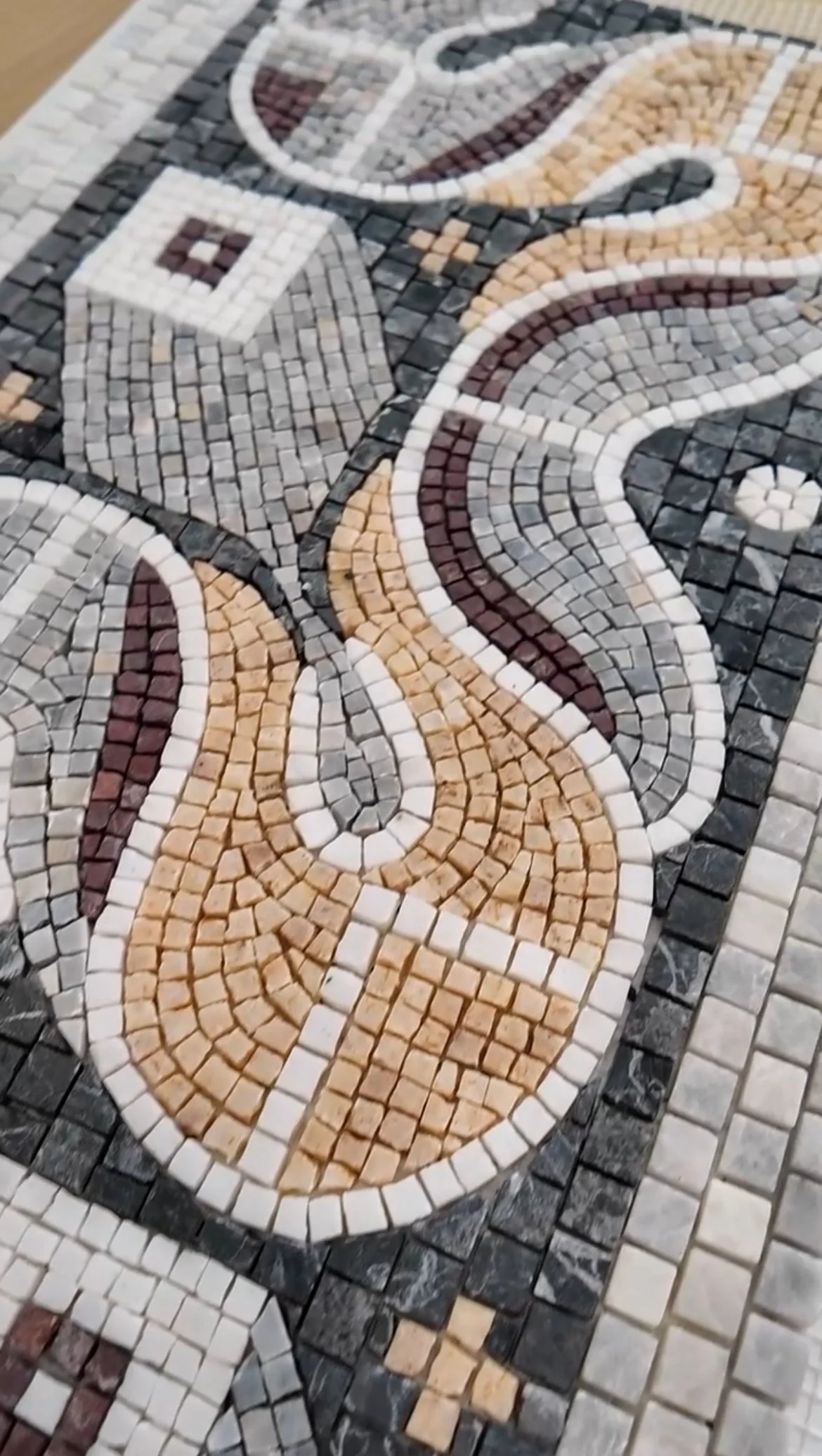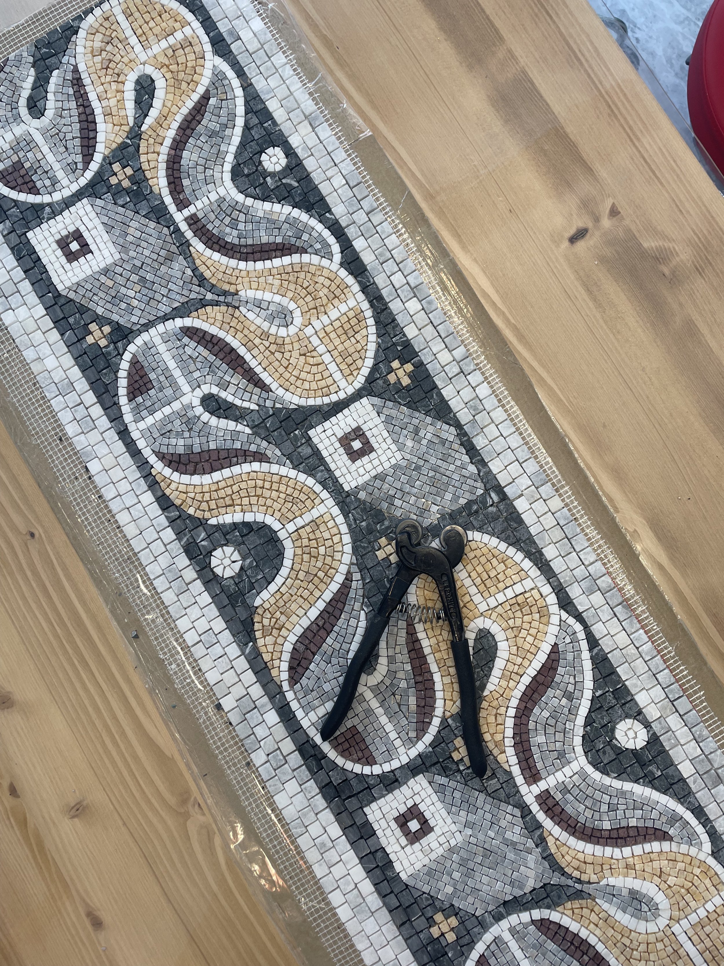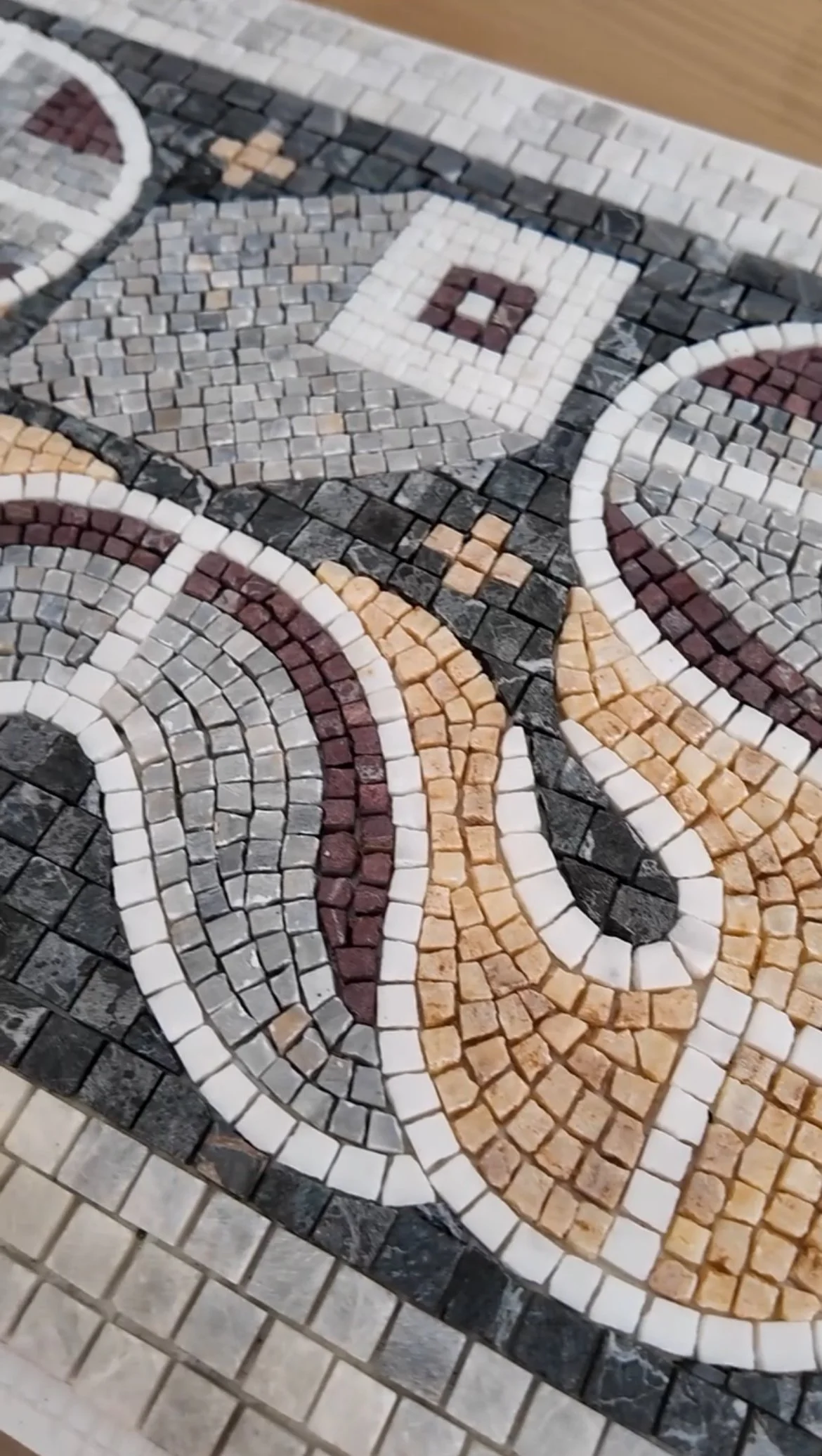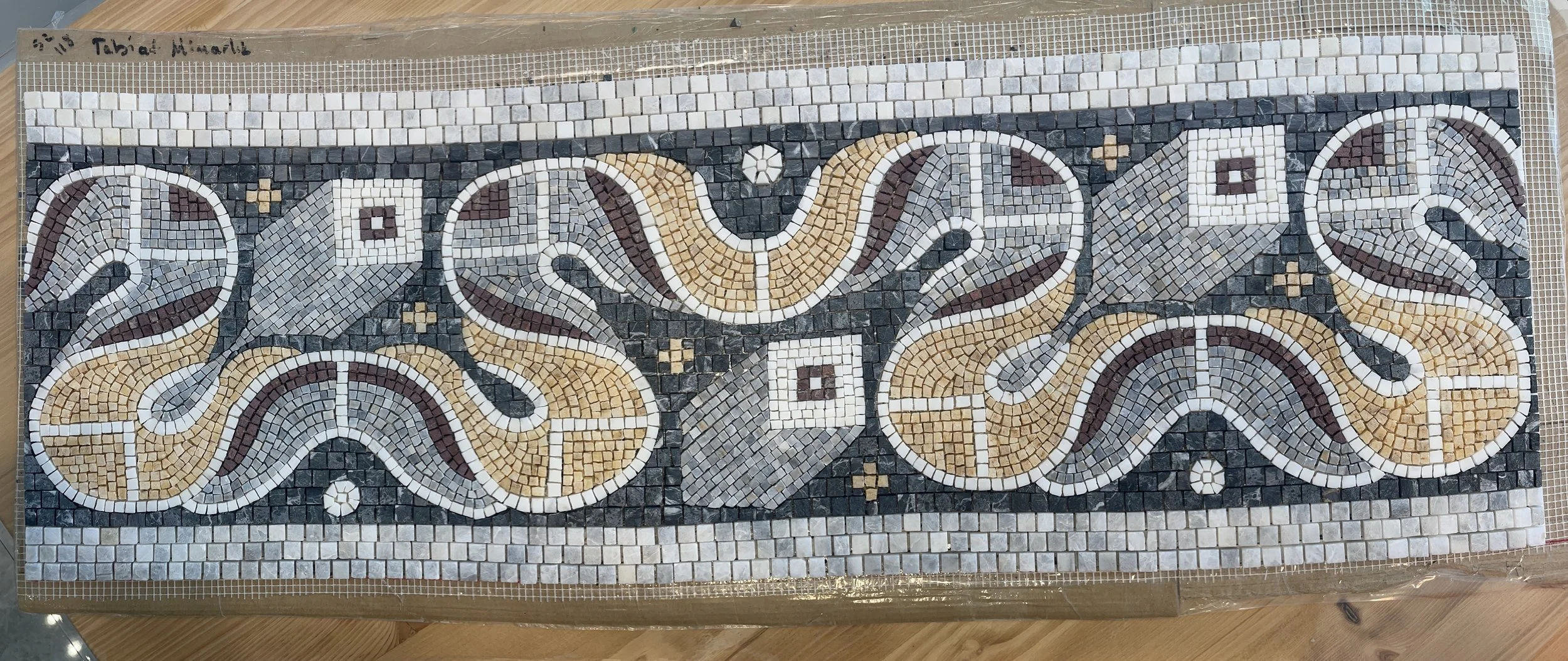 Bu 30x90 cm boyutundaki mozaik, Karabük’te yer alan Hadrianapolis Antik Kenti’nde bulunan geometrik zemin süslemelerinden esinlenerek tasarlandı. Özel sipariş üzerine, banyo aynası ve lavabo arasındaki alana yerleştirilmek üzere üretildi.