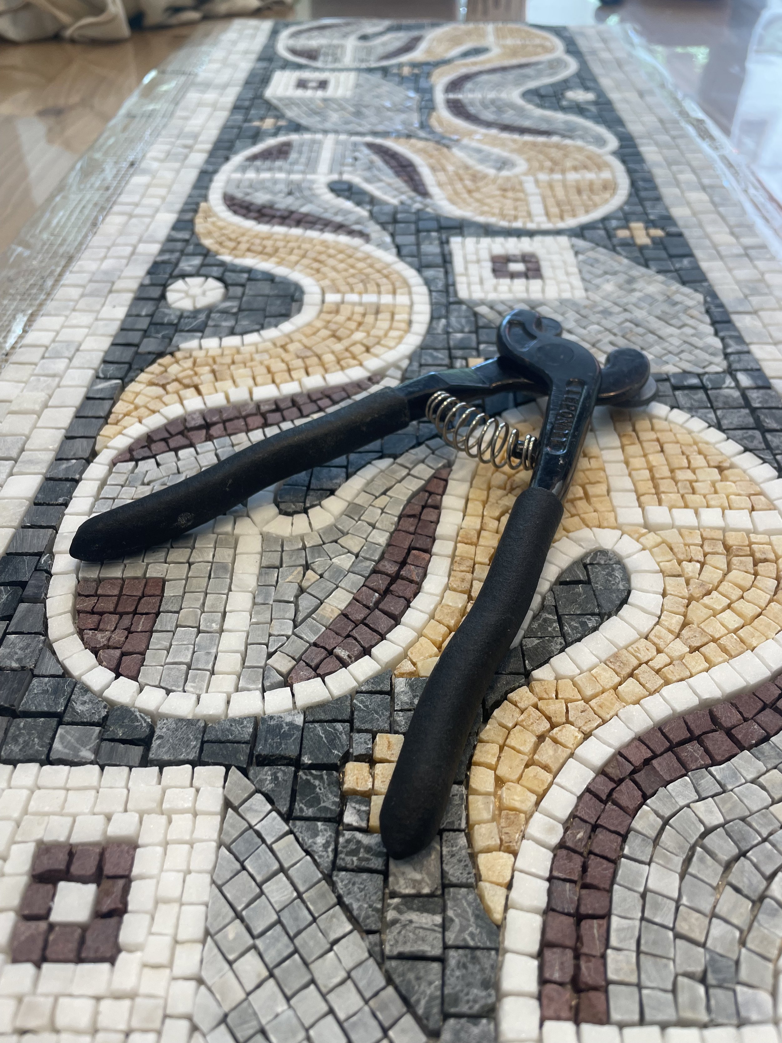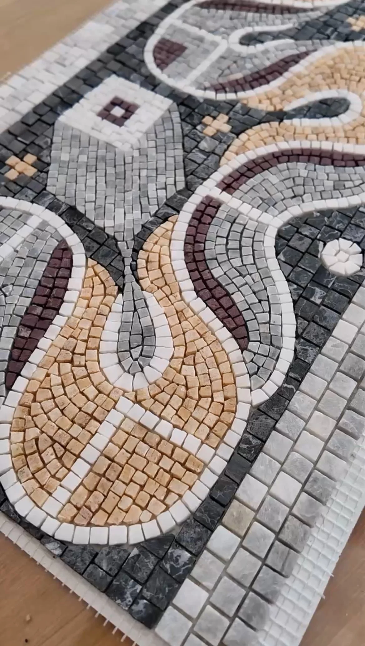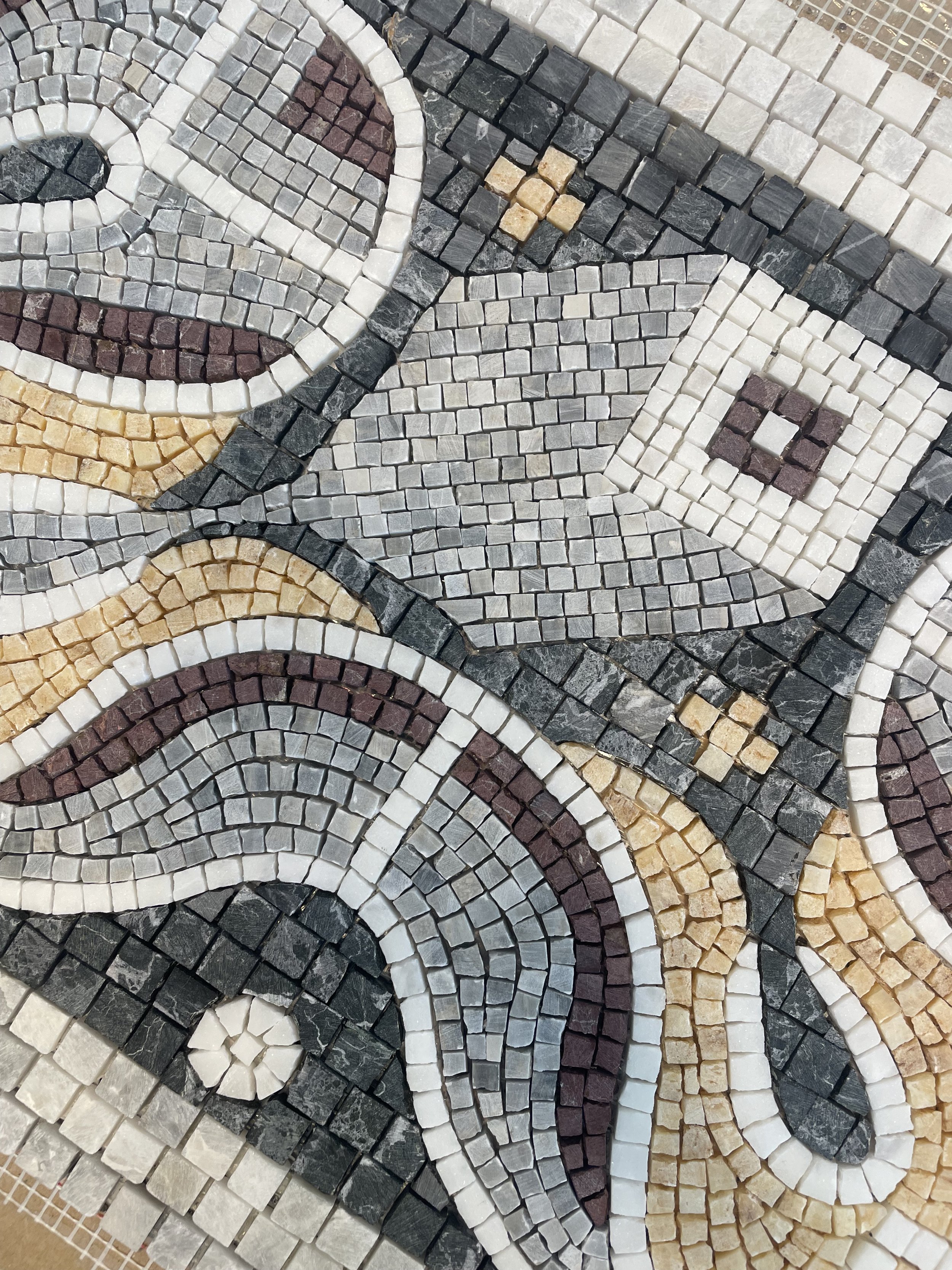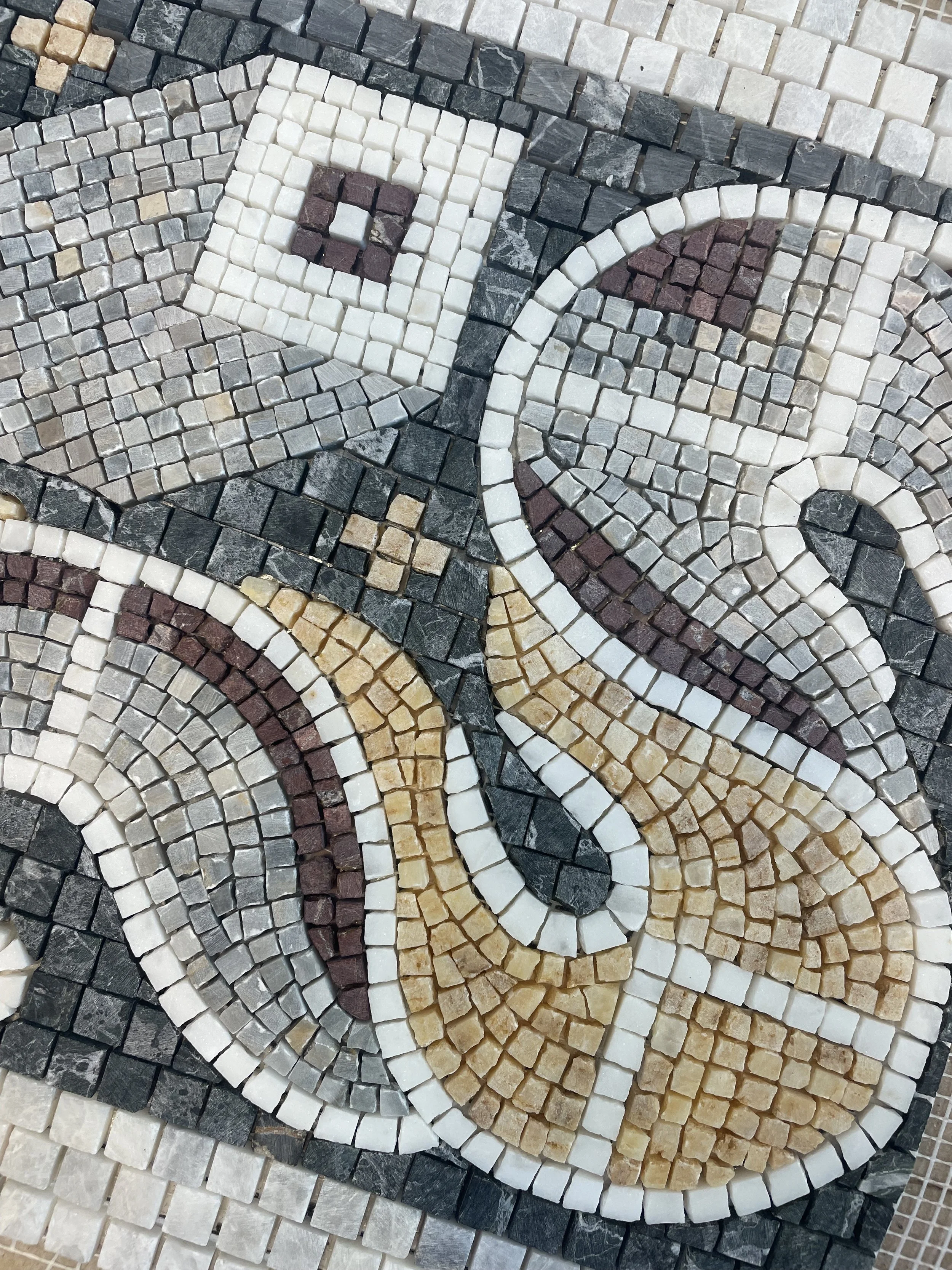Bu 30x90 cm boyutundaki mozaik, Karabük’te yer alan Hadrianapolis Antik Kenti’nde bulunan geometrik zemin süslemelerinden esinlenerek tasarlandı. Özel sipariş üzerine, banyo aynası ve lavabo arasındaki alana yerleştirilmek üzere üretildi.